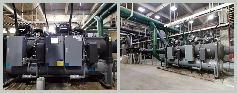 富士康观澜园区B25栋中央空调机房于2010年投用,位于二层能源中心,冷却塔设于楼顶,为B10至B13栋厂房生产车间供冷。系统由4台3867.6KW离心主机、1台1933.8KW离心主机及1台1760KW螺杆主机组成,全年不间断运行,能耗高、设备老化问题突出。