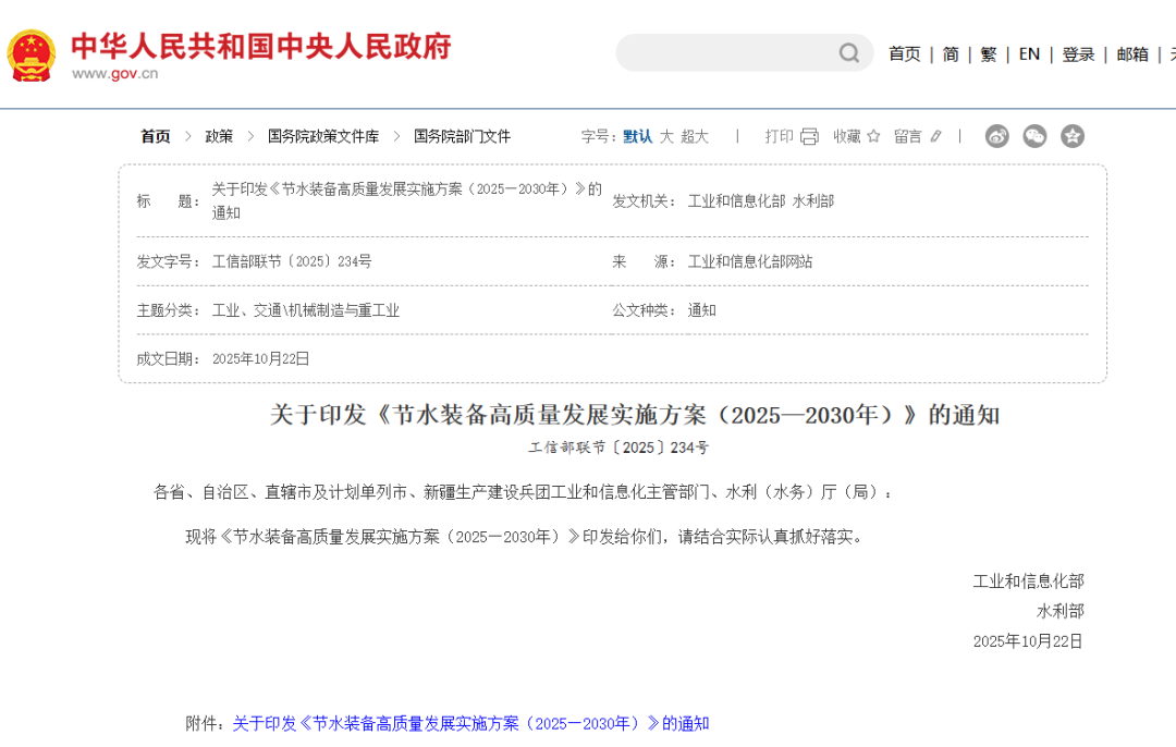 工信部、水利部联合印发《节水装备高质量发展实施方案(2025—2030年)》